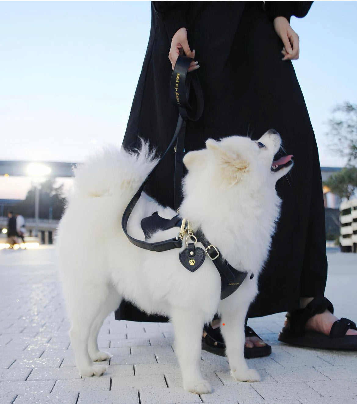 ホワイトレザーとシルバーの金具の組み合わせが最高です。ハーネスは一度サイズを調整すればそのあとの着脱は金具でカチッと止めるだけと本当に楽